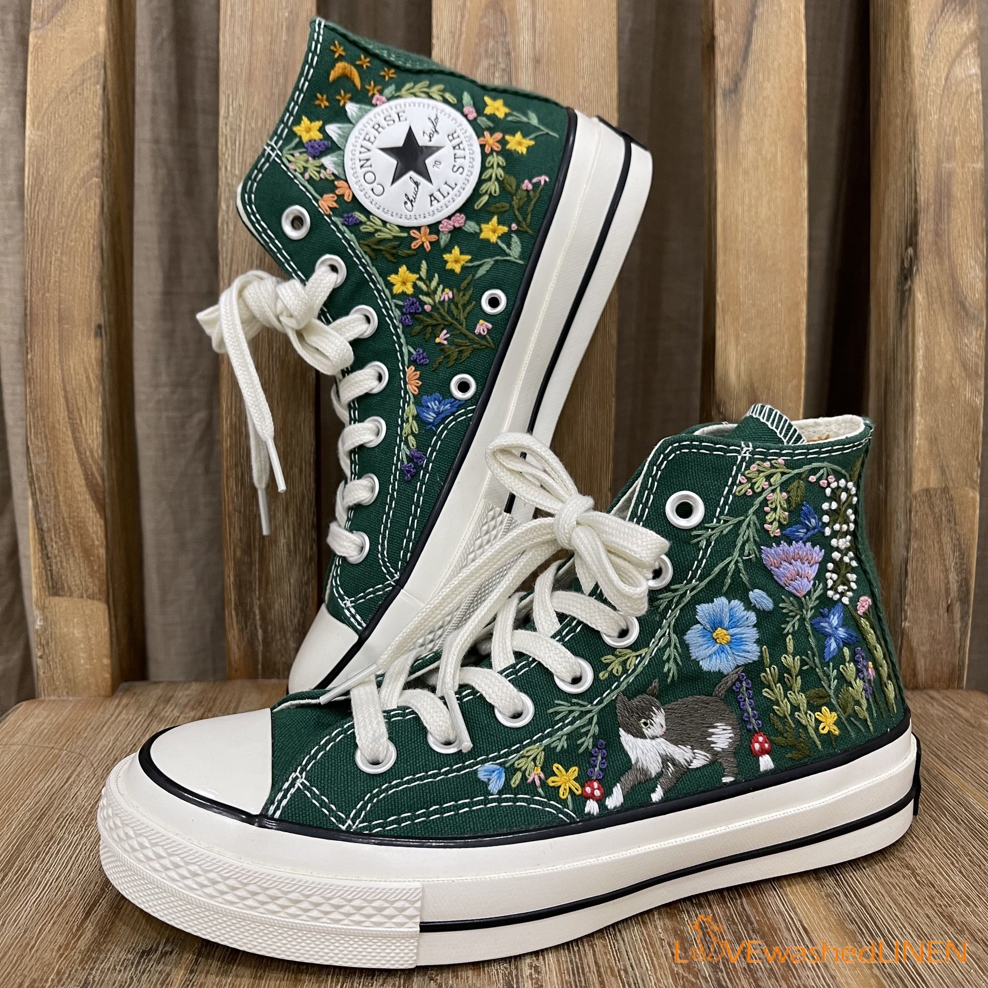 Custom Converse Chuck Taylor Embroidered/ Cat Garden Flowers Embroidered Convese Shoes/ Embroidered Converse Custom Wedding Flowers