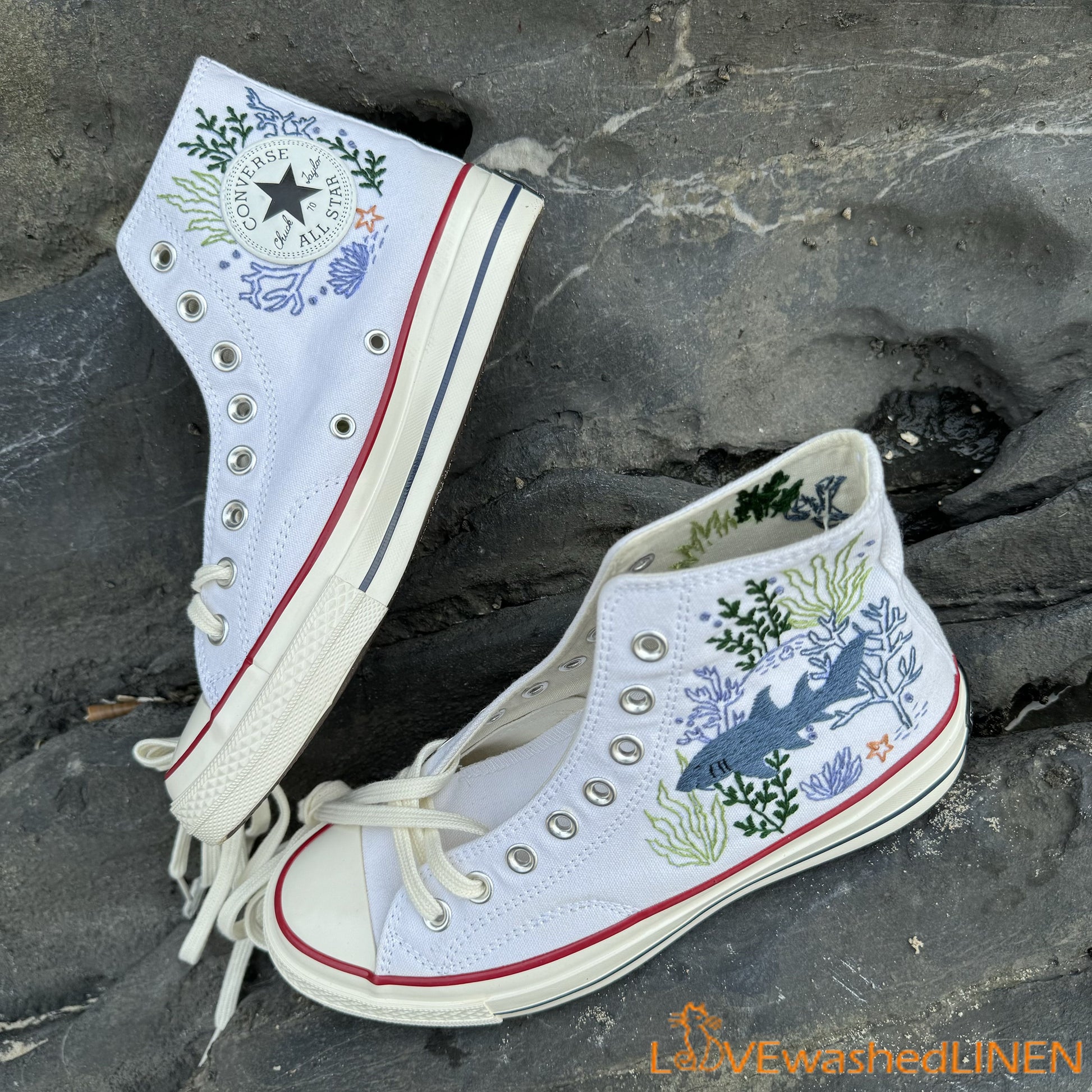 Custom Embroidered Converse High Tops/ Custom Converse Chuck Taylor 1970s Shark Embroidered/ Ocean Vibes Embroidered