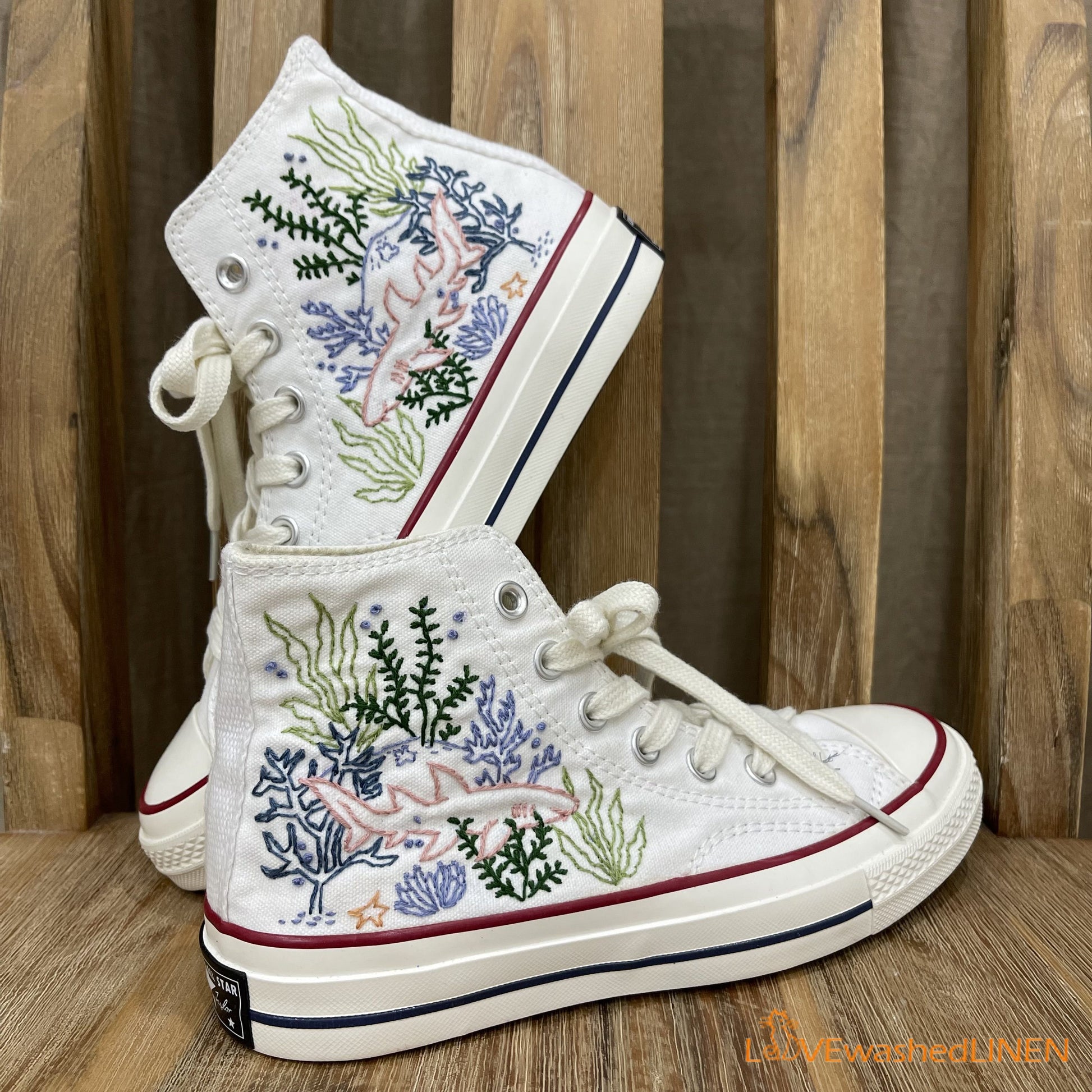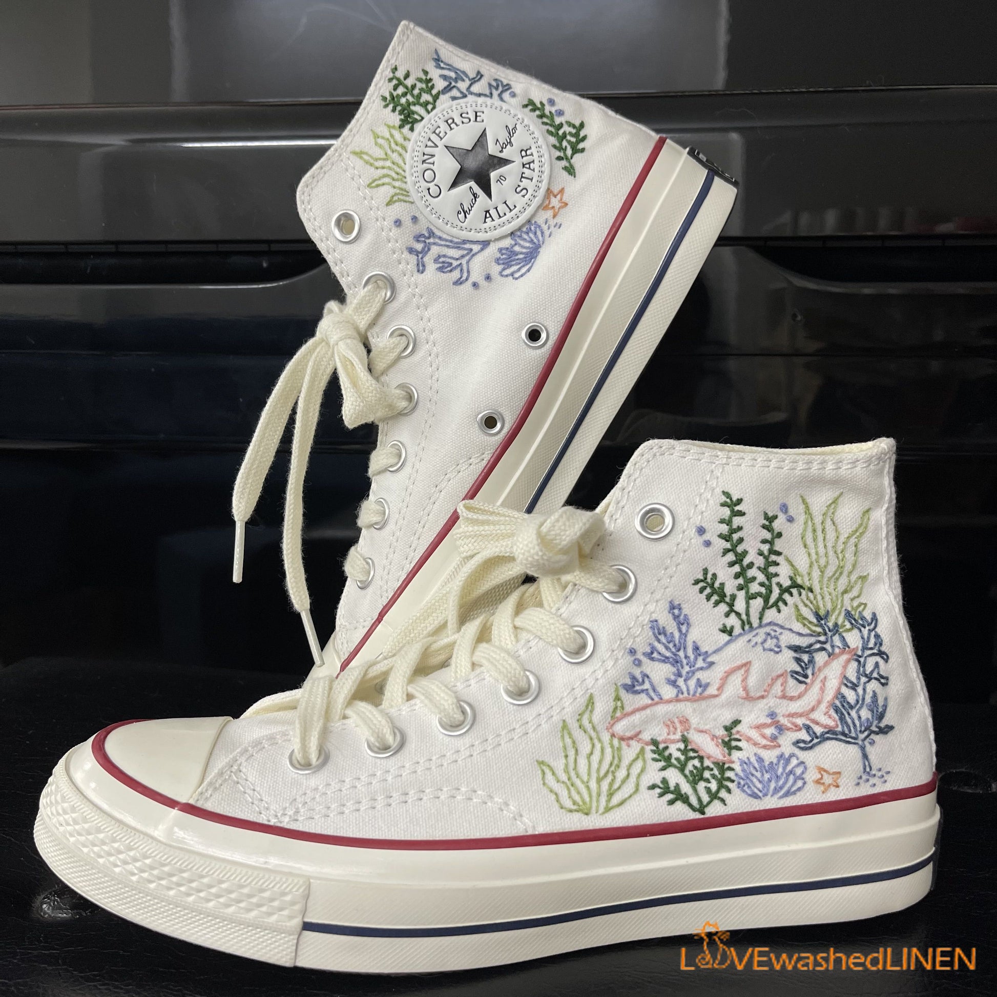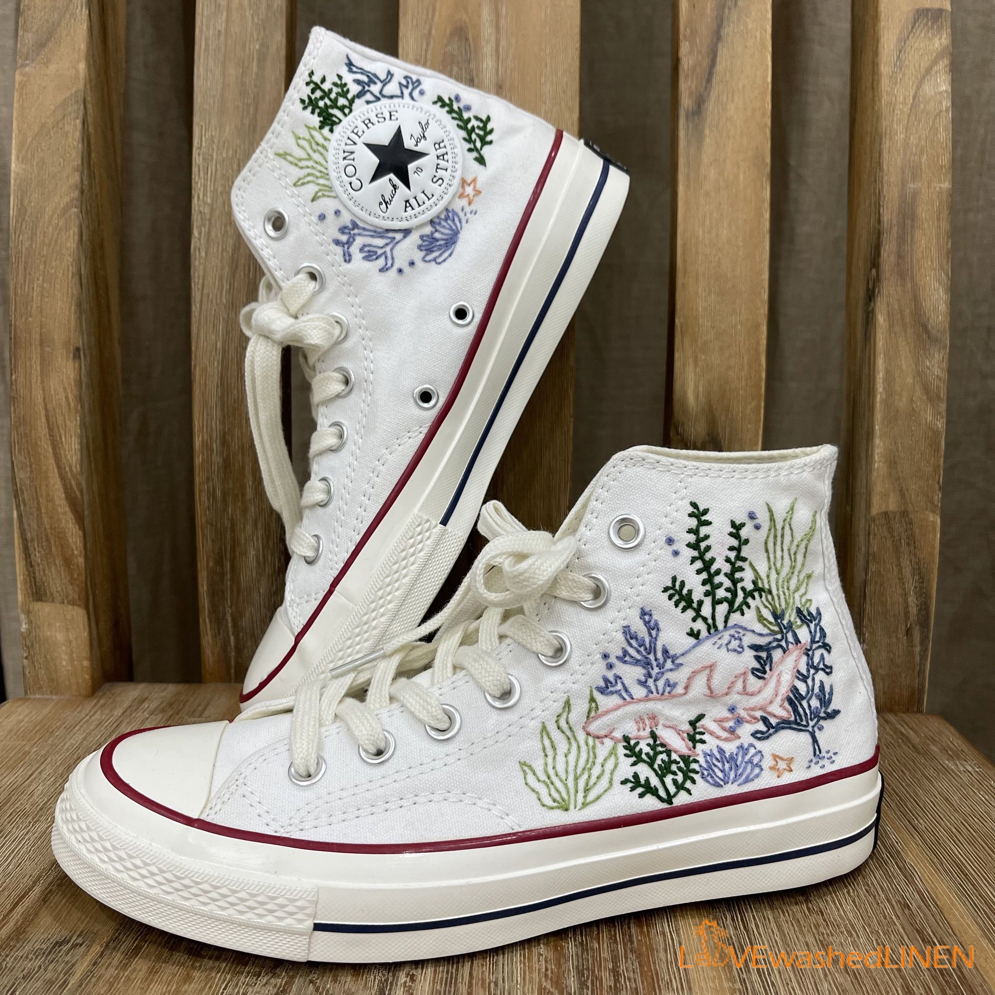 Custom Embroidered Converse High Tops/ Custom Converse Chuck Taylor 1970s Shark Embroidered/ Ocean Vibes Embroidered