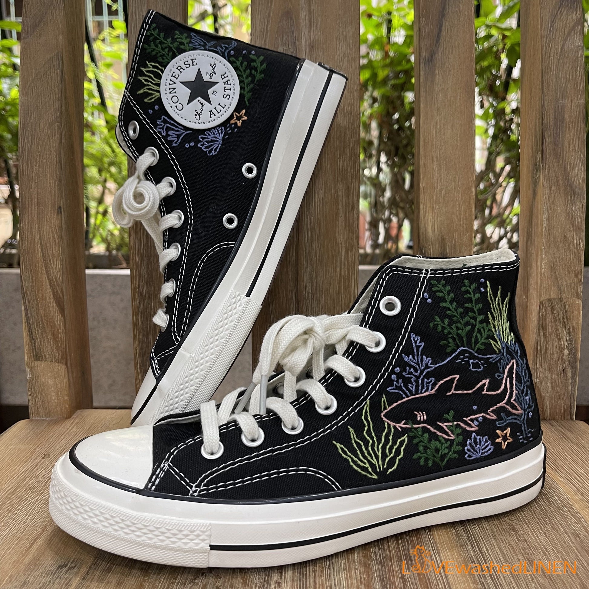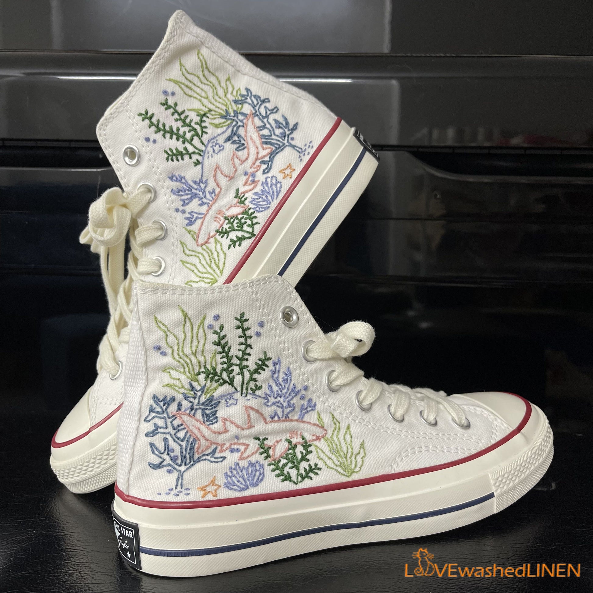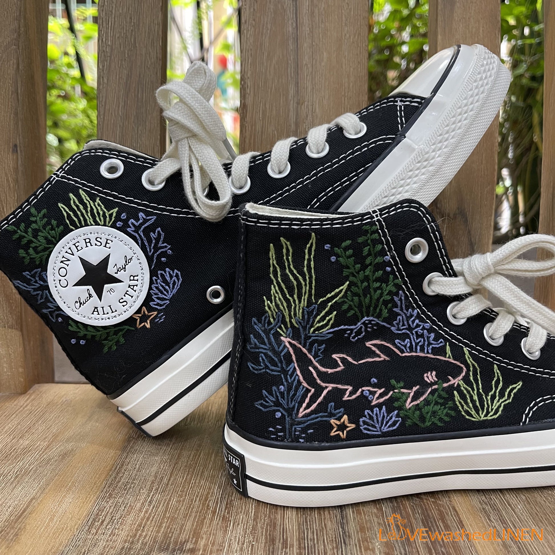 Custom Embroidered Converse High Tops/ Custom Converse Chuck Taylor 1970s Shark Embroidered/ Ocean Vibes Embroidered