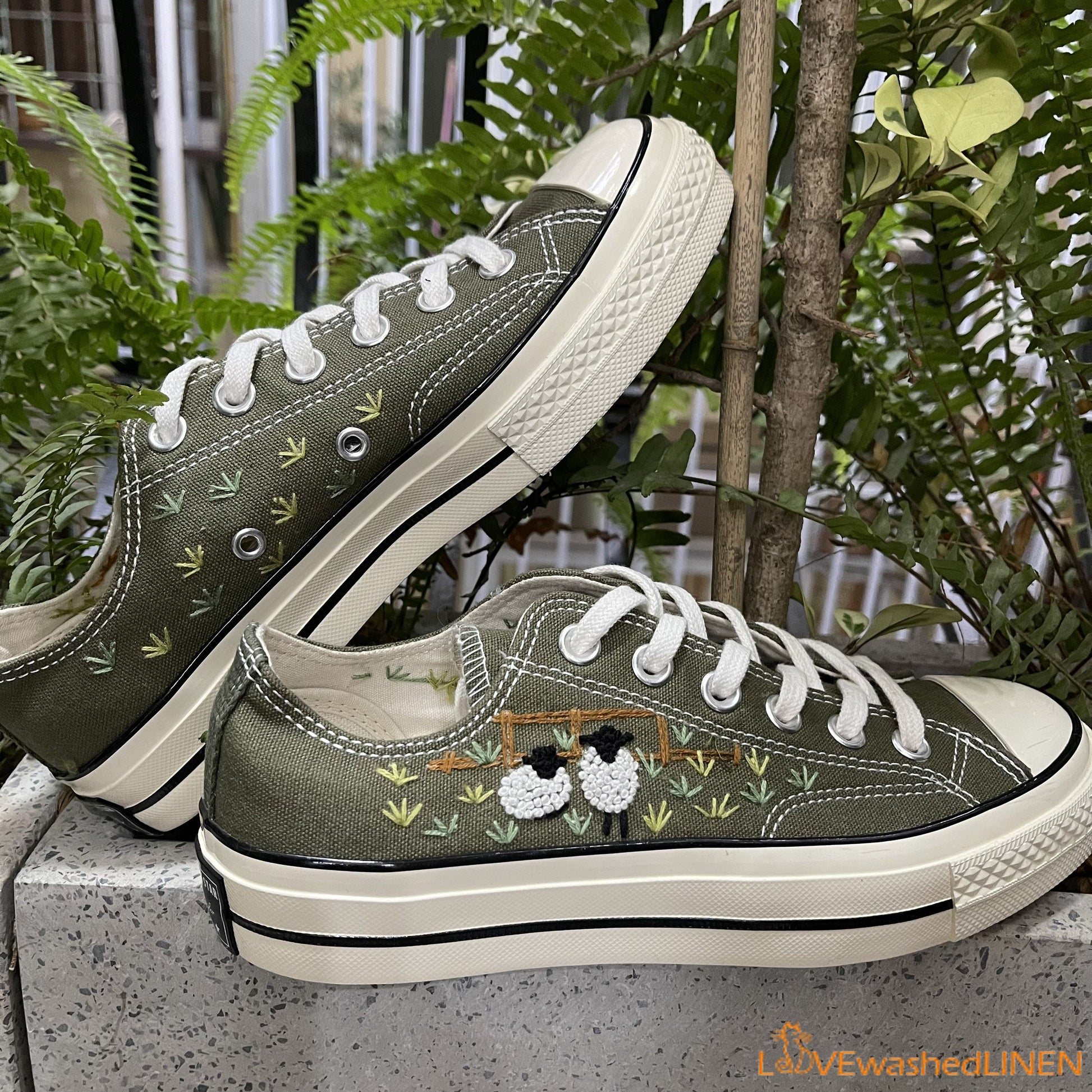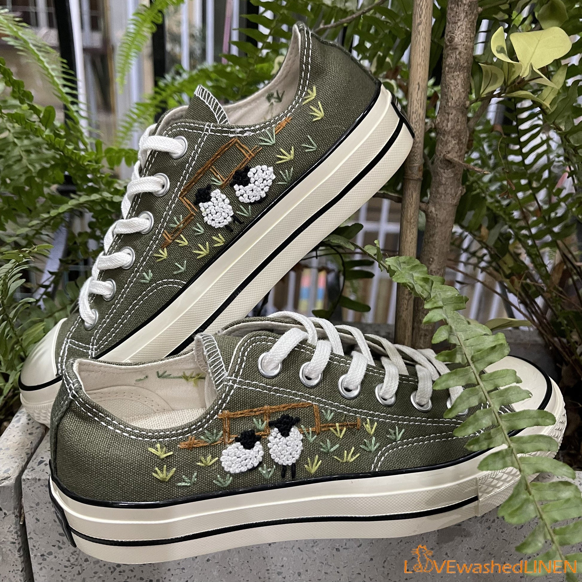 💚 Look at 2 cute lambs! Green farm, wooden fences and lambs looks great on green Converse shoes 💚